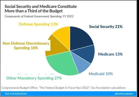 Here is a pie chart of federal spending. Social Security, Medicare and Medicaid are 44%. Toss in the other mandatory spending--a big chunk of which is interest paid on federal debt--and there's not much left to cut. The reality is there is no way to slow the runaway debt train without tackling open-ended retirement / healthcare programs.