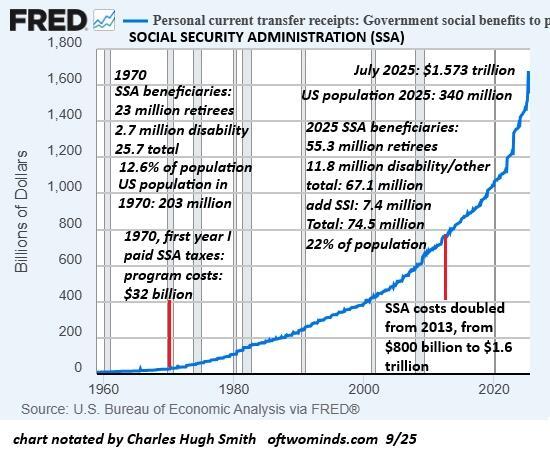 In 2025, the situation has changed. The US population increased 67% to 340 million, the number of SSA beneficiaries has nearly tripled from 25.7 million to 74.5 million, and the program now costs about $1.6 trillion annually--almost double the 2025 DoD budget of $840 billion.