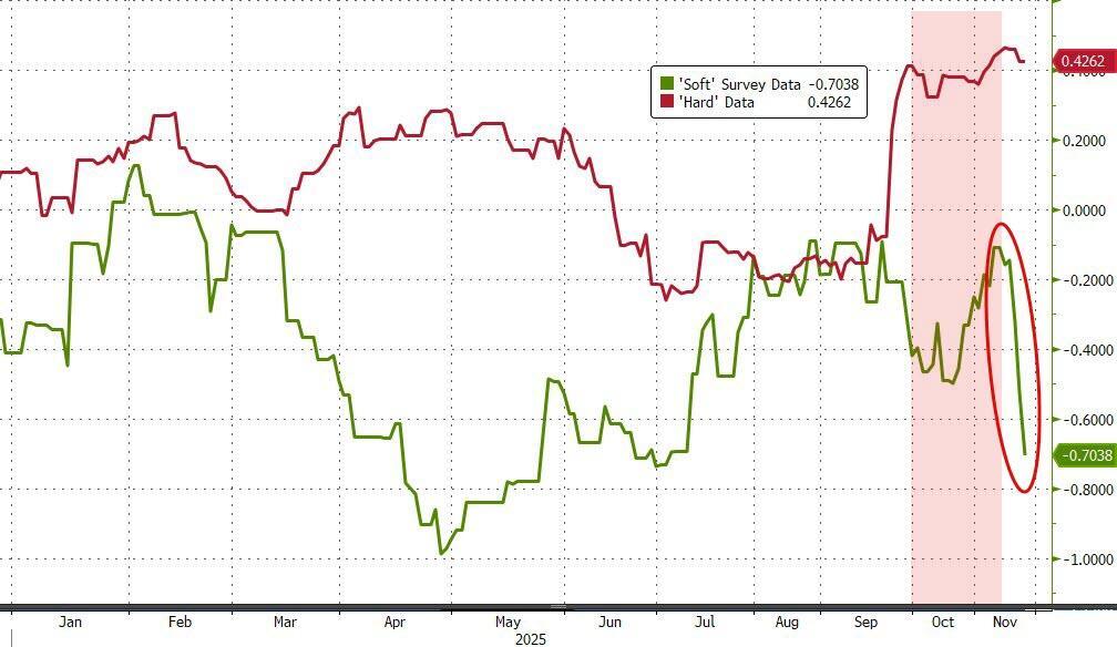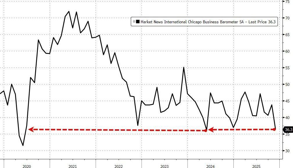 MNI's Chicago Business Barometer Report came in dramatically worse than expected for November, printing 36.3 (the lowest since May 2024), well below expectations of 43.6 and the prior print of 43.8