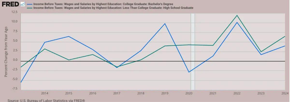 The income advantages are still there for a college education but even here, we are seeing a generational shift. The pace at which income is rising for those who choose trades has more upward energy than those without. The gap is there but narrowing.