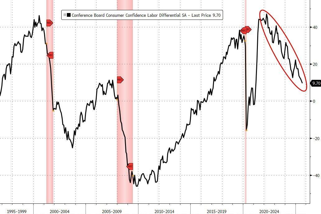 “The present situation and the expectation components both weakened. Notably, consumers’ appraisal of current job availability declined for the eighth consecutive month, but stronger views of current business conditions mitigated the retreat in the Present Situation Index.'