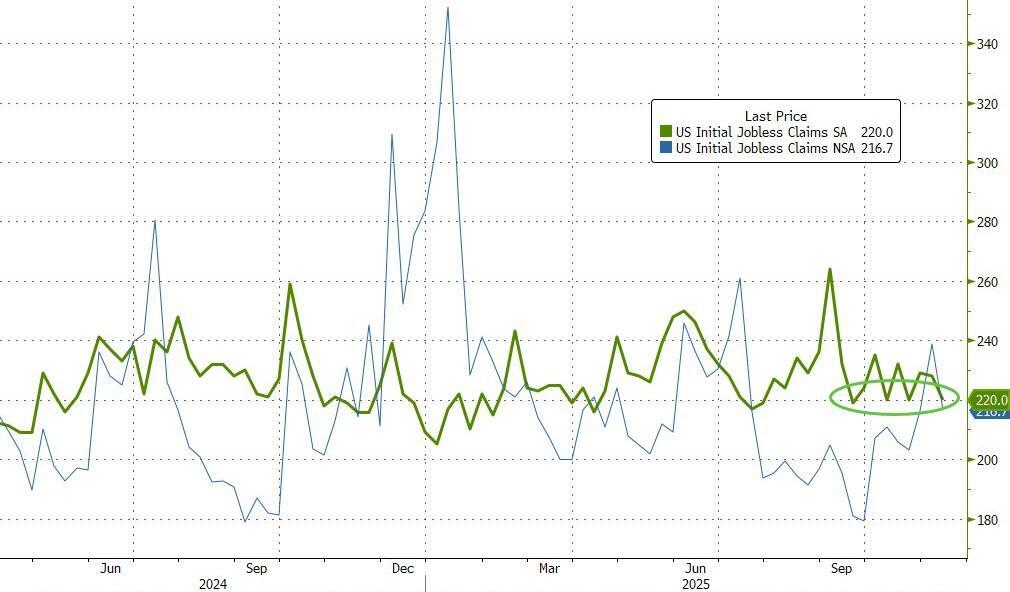 Initial jobless claims dropped back near 2025 lows (220k, below expected)...