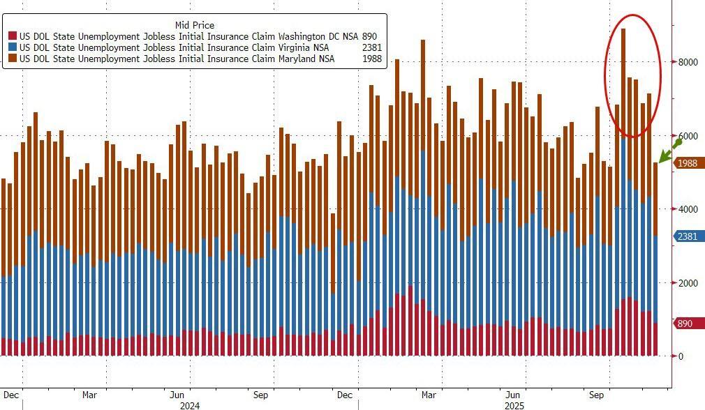 Likely thanks to the shutdown, we note that initial jobless claims for the 'Deep Tristate' fell significantly...