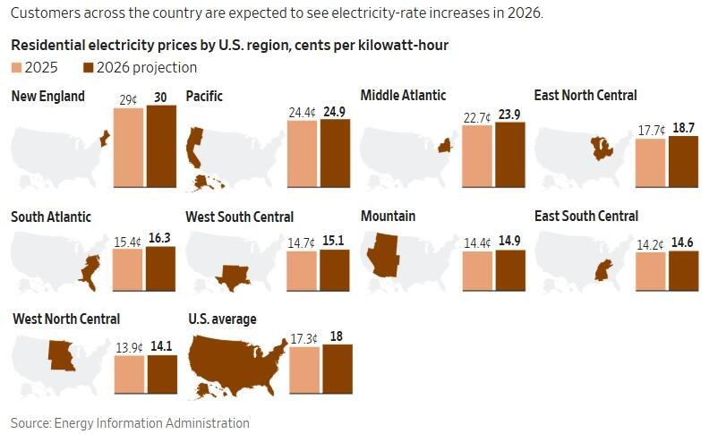 According to the Wall Street Journal, electricity prices have risen meaningfully across much of the country since 2022, and the drivers extend well beyond the frequently cited surge in data-center demand.