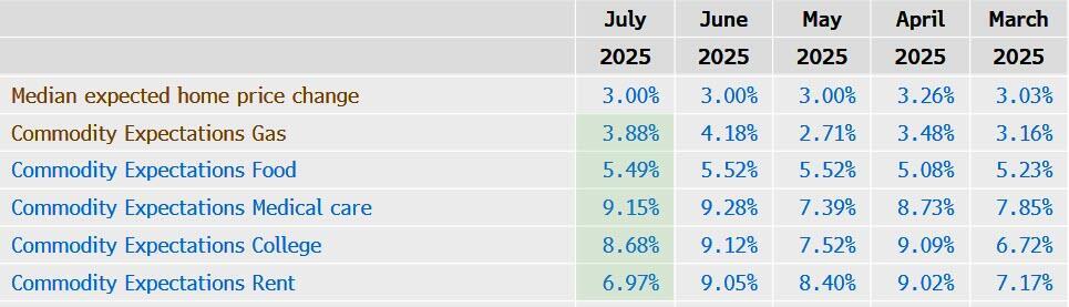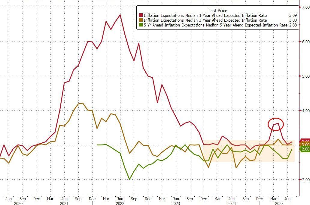 According to the latest data from The New York Fed's Sentiment Survey, Americans (on average) agree with Waller with households' inflation expectations barely moving in July, and still below the levels pre-Liberation Day...