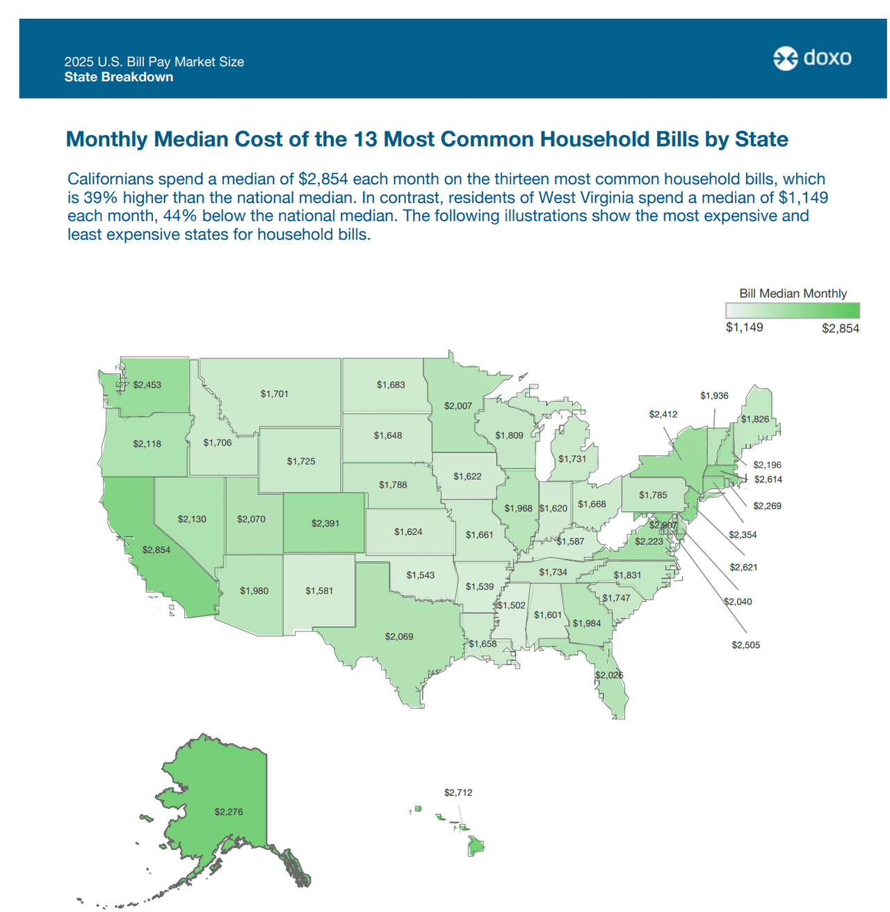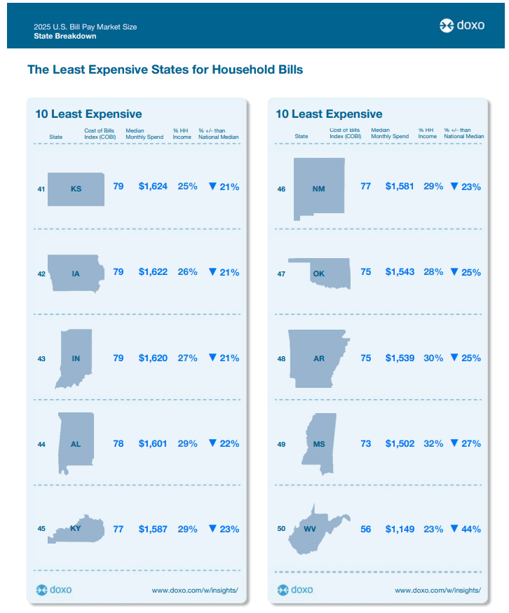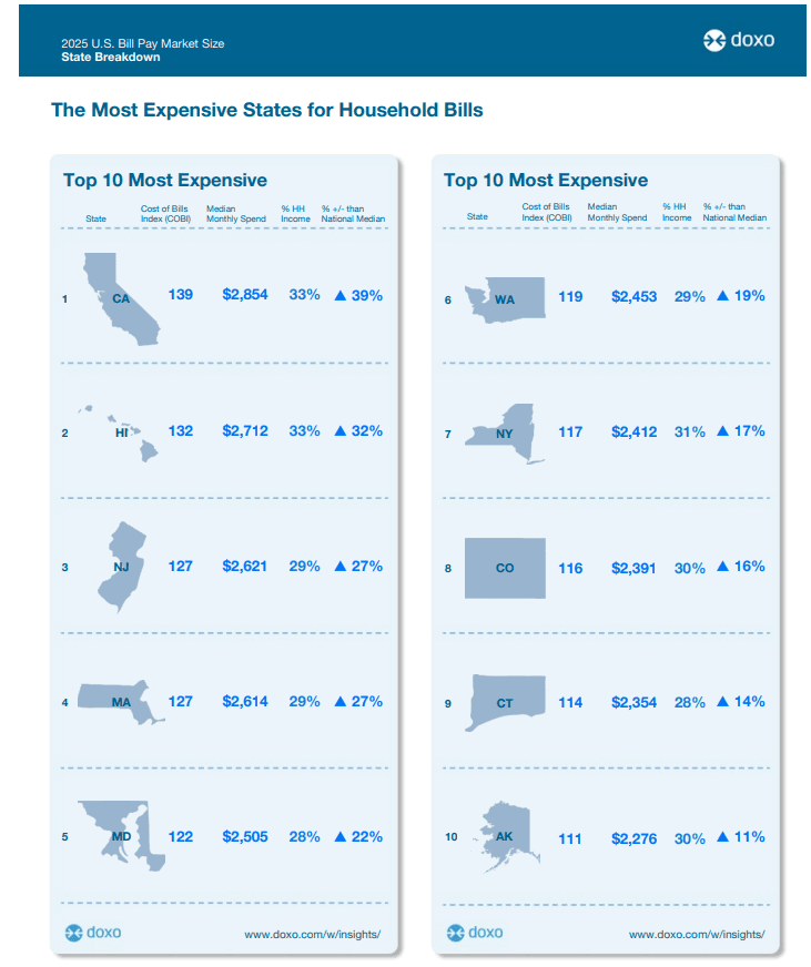 Against this complicated macroeconomic backdrop for consumers, new data from DoxoINSIGHTS’ 2025 State-by-State Bill Pay Market Report provides a granular view of household bill costs nationwide. The report ranks states by monthly expenses, highlighting the most and least expensive places to live.