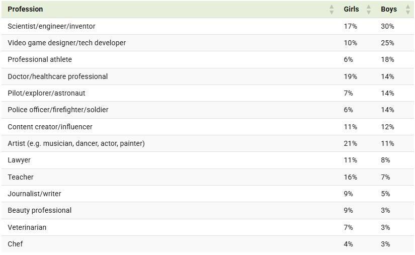 Below is the breakdown of Gen Alpha’s career aspirations by gender, showing the percentage of boys and girls who named each profession as their dream job: