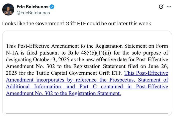 Bloomberg ETF analyst Eric Balchunas said that Tuttle Capital Government Grift ETF (GRFT) could launch as early as Friday, as the Securities and Exchange Commission on Monday set Oct. 3 as the date that Tuttle’s S-1 registration statement will become effective.