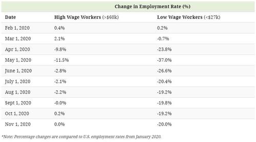 Less than half the jobs lost earlier this year have returned for those making under $20 per hour. To give you a broader perspective, here’s a look at the percent change of employment rates from February through to November 2020: