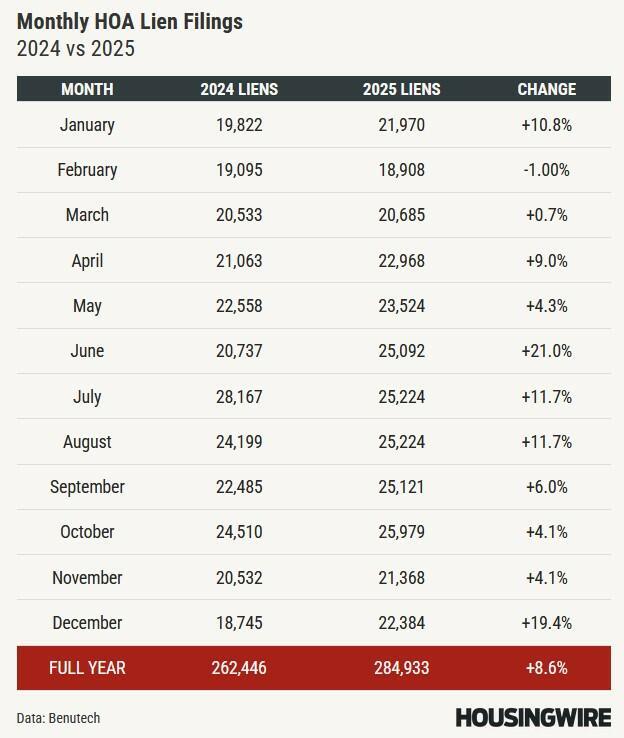 U.S. homeowners associations filed 284,933 liens against property owners last year - an 8.6% increase from 262,446 liens in 2024 and the equivalent of roughly one lien every 90 seconds - according to property records analyzed by Benutech.