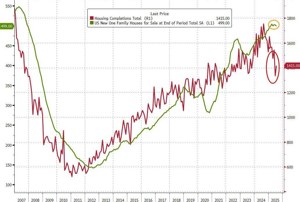 Homebuilder pain is obvious in this chart as completions plunge thanks to existing home inventory holding at its highest level since 2007...