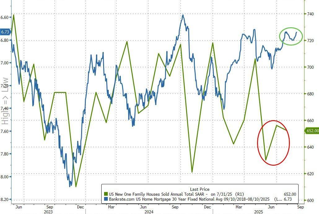 Rate cuts have steepened the yield curve and pushed mortgage rates up; but as the chart above shows, the relationship between new home sales and actual mortgage rates has decoupled in recent weeks...