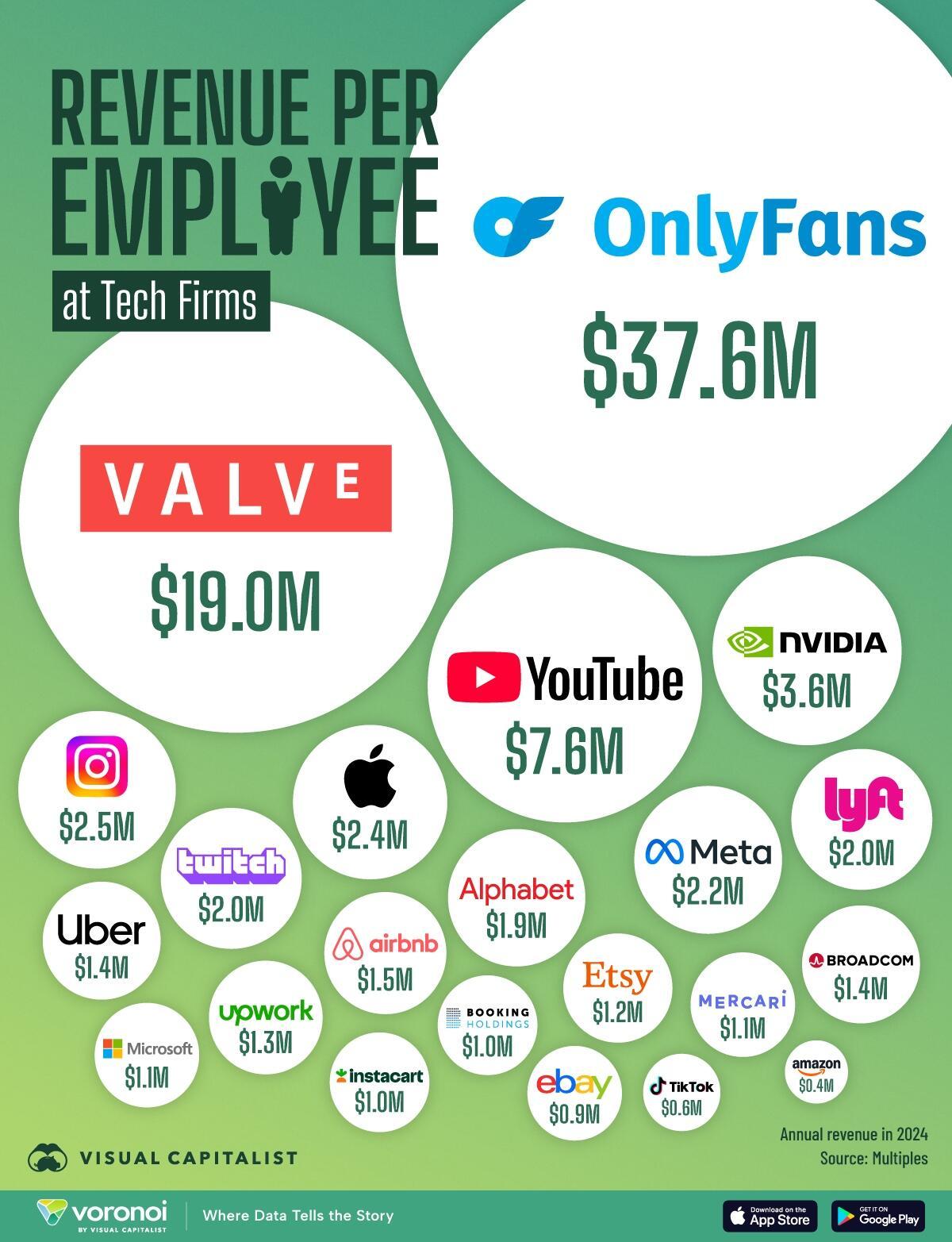 In this graphic, Visual Capitalist's Marcus Lu visualized 22 major tech companies by revenue per employee in 2024, highlighting the efficiency of business models that monetize user-generated content.