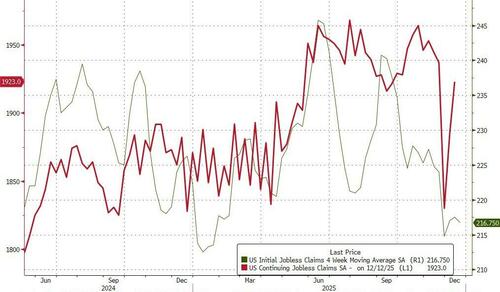Continuing jobless claims rebounded from the shutdown/Thanksgiving seasonal SNAFU but remain well off YTD highs...