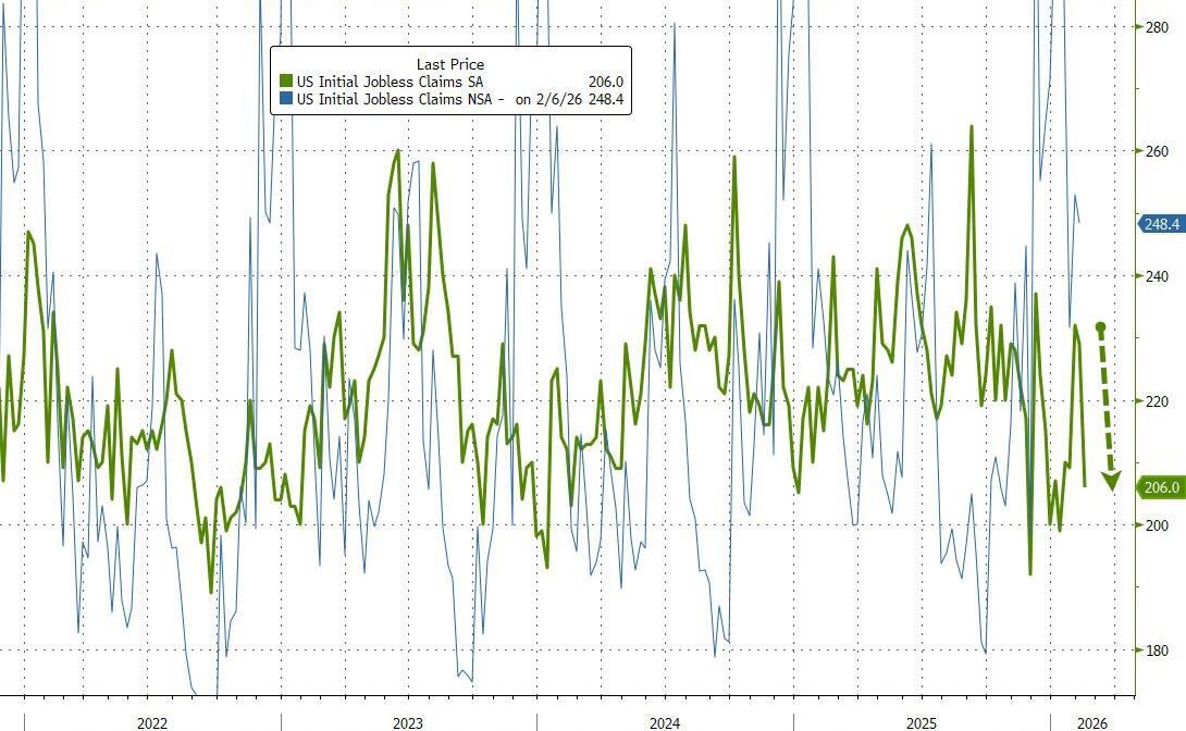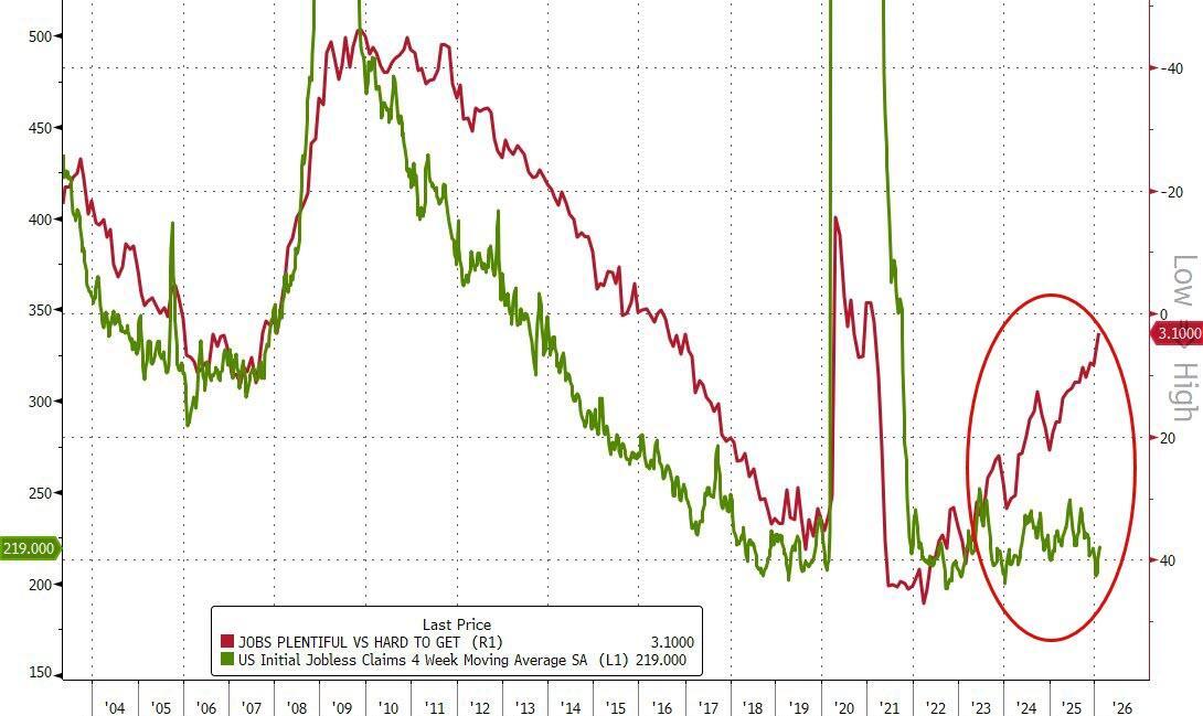 Despite the ongoing worsening trend in some labor market condition indicators - Payrolls revisions ugly, JOLTs are tumbling, Survey-based data showing jobs hard to get far worse than jobs plentiful - the number of Americans filing for jobless benefits for the first time fell to 206k (from 229k the prior week)...