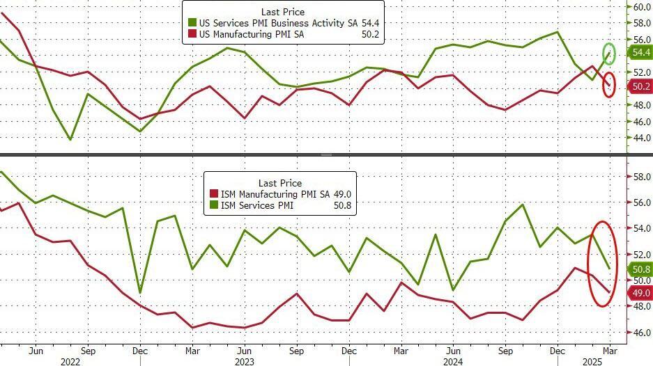 Following the significant decline in US Manufacturing 'soft' survey data (while hard data keeps rising with manufacturing jobs jumping most in years according to ADP), expectations for this morning's Services Sector PMIs are mixed.