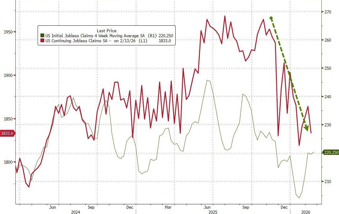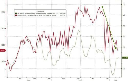 The number of Americans filing for continuing jobless claims also dropped last week to 1.833 million (well below the 1.9mm Maginot Line)...