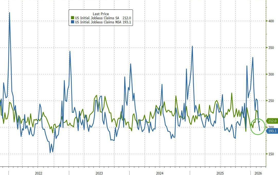 Last week saw 212k American file for jobless benefits for the first time (below the 216k expected). Unadjusted claims tumbled to the lowest since September...