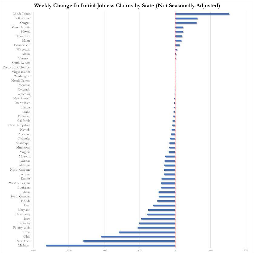 Michigan and New York saw the largest drop in initial jobless claims last week while Rhode Island and Oklahoma saw the bigger rise in claims...