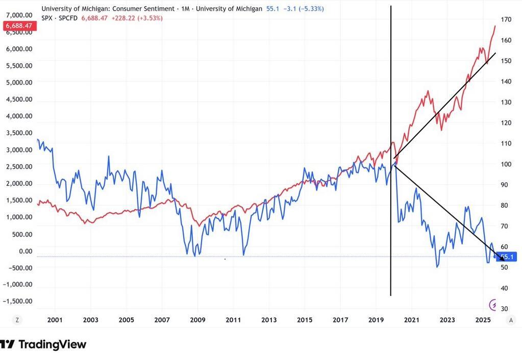 The graph below showing the stark divergence between the S&P 500 and the University of Michigan consumer survey best depicts the K shaped economy.