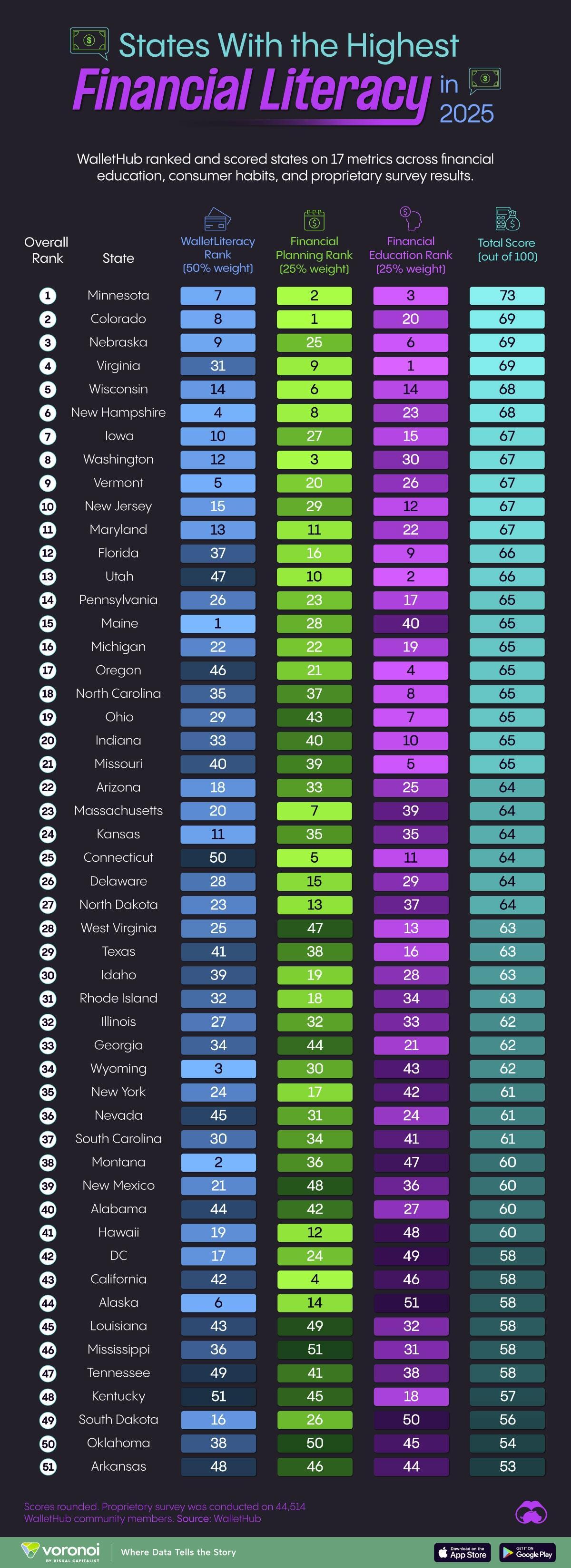 This financial literacy map, via Visual Capitalist's Pallavi Rao, attempts to answer both questions using 2025 data from WalletHub, a personal finance services company.