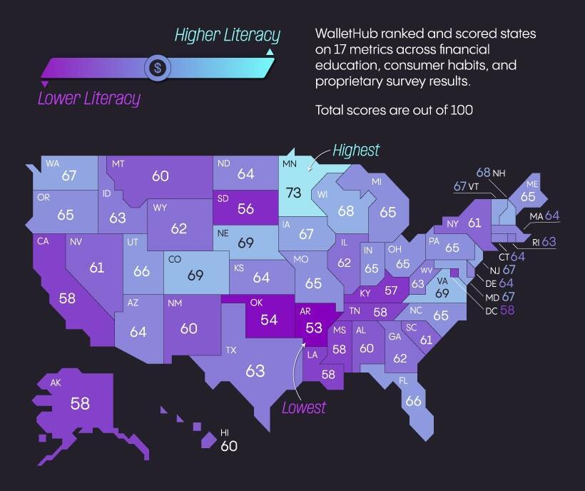 Minnesota is the most financially literate U.S. state with 73 points, according to WalletHub’s latest analysis.