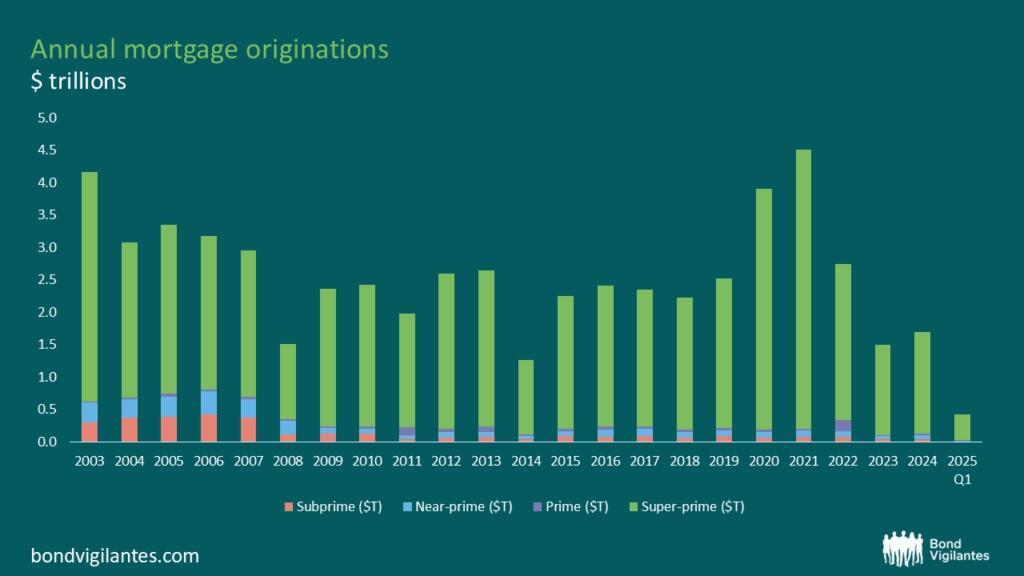 Activity in the US housing market has ground to a halt, as older homeowners who have locked in low interest rates, or have paid off their homes altogether, are choosing to hold tight to significant amounts of housing inventory. Originations of mortgages in the US (which include new financing and refinancing) could hit two-decade lows, with the majority of transactions among the highest income (highest credit score) borrowers.