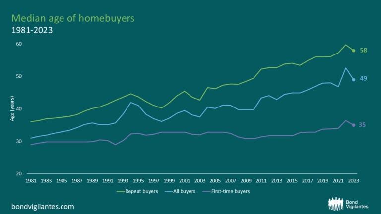 The median age of both first-time and repeat homebuyers continues to rise, as the combination of an undersupply of homes (both new and existing) and higher mortgage rates continues to keep younger buyers on the sidelines, with wages unable to keep up with parabolic increases in homeownership costs.