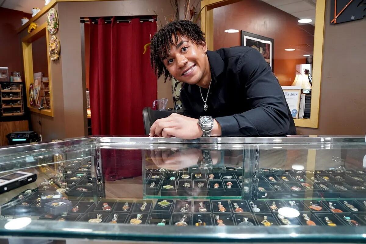 Mikah Snowden, a sales representative at Galina Fine Jewelers in Cottonwood, Ariz., works behind the showcase on March 20, 2023. Allan Stein/The Epoch Times
