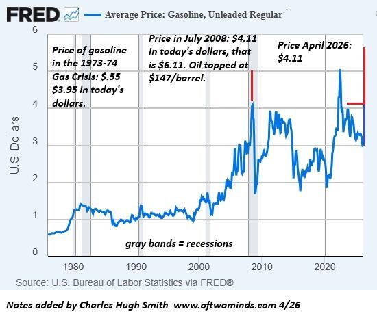 It's not a specific price point or metric that causes recession: it's the decay of confidence and discretionary income that leads to recession. Confidence is fragile by its very nature. We've been selected to be wary of surplus suddenly becoming scarcity, and rising prices of energy cascading through the entire economy activates a reappraisal of our complacent confidence.
