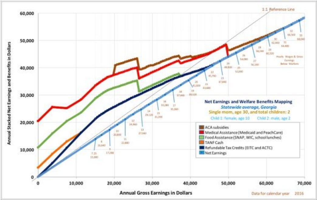 The Georgia Center for Opportunity created an interactive tool that models how income changes affect eligibility for various state and federal benefits (see BenefitCliff.org for details). Below you can see a graph from their report, “Disincentives for Work and Marriage in Georgia’s Welfare System.” Every dip you see in this graph is a benefit cliff.