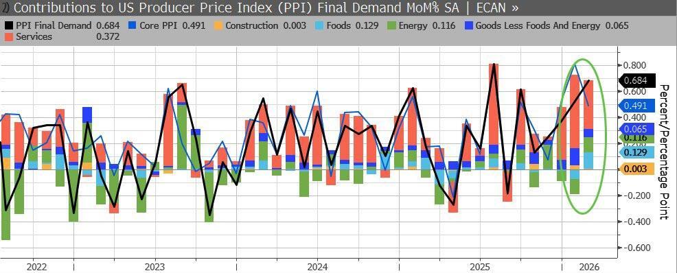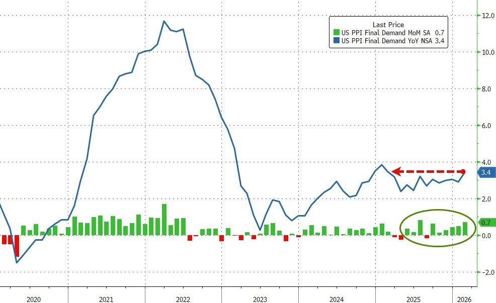 After a hotter than expected print in January, US Producer Prices were expected to continue to rise (but only modestly) in February data released today. The consensus direction was right but the scale was way off as headline PPI accelerated 0.7% MoM (vs +0.3% exp and +0.5% prior) - the biggest monthly jump since July 2025.