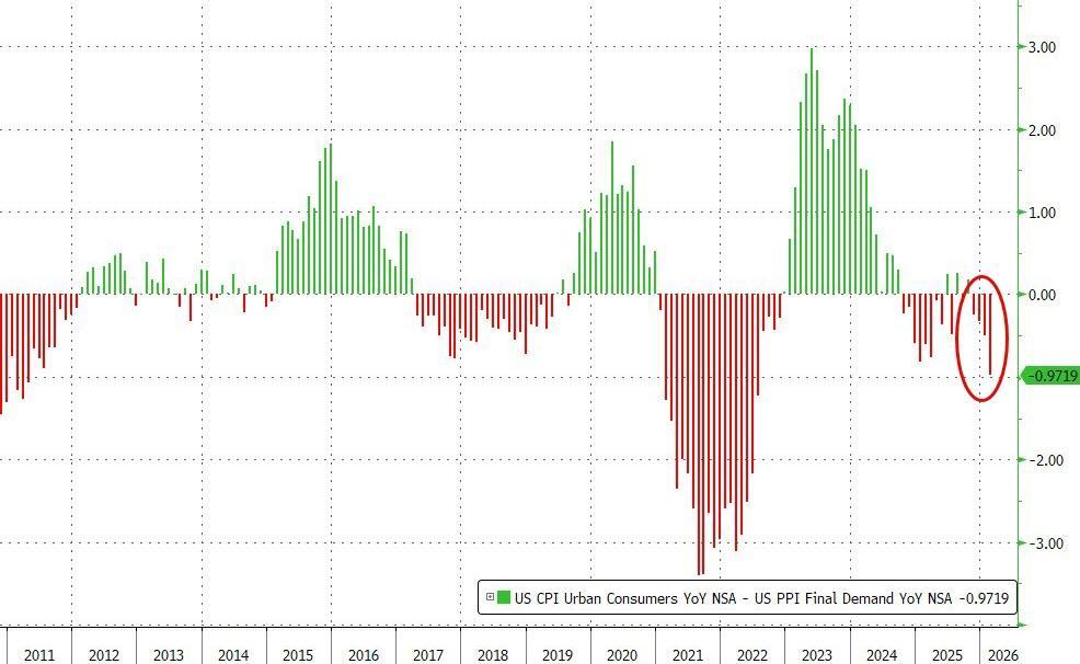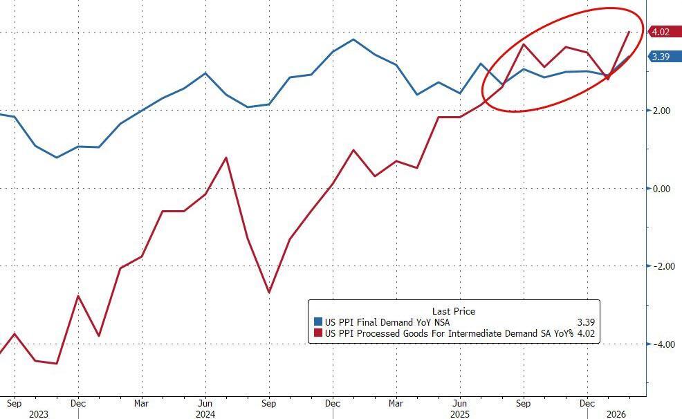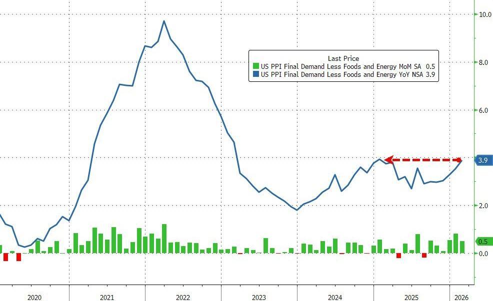Core PPI (ex Food and Energy) also soared (+0.5% MoM) pushing core prices up by 3.9% YoY - the highest since Jan 2025...
