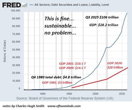 Without a steady expansion of debt and a steady debasement of the dollar so debtors have an easier time paying existing debts, the economy would crash, and so doing more of what leads to collapse is the status quo "solution."