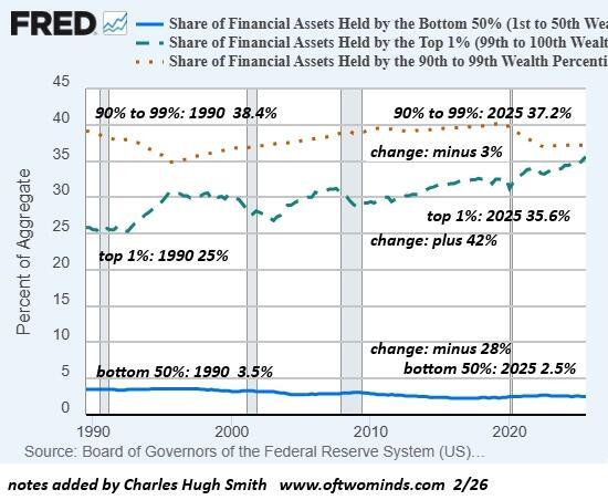 Recall that the top 10% own the vast majority of financial assets, with the bottom 50% owning a wafer-thin 2.5% of financial assets, a 28% decline from their 3.5% share in 1990. The share owned by the top 1%, meanwhile, rose by 42% to 35.6%.
