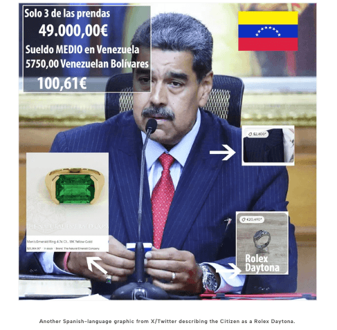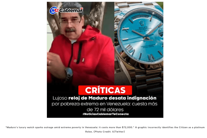Over the past few years, Spanish-language social media accounts and news outlets have promoted a theory that Maduro owns expensive Rolex references, often citing an interview where Maduro reportedly covers up a “Rolex” with his sleeve when the interviewer notices the watch. The only problem is that the watch in question is actually a Citizen, with a retail value of approximately $250.