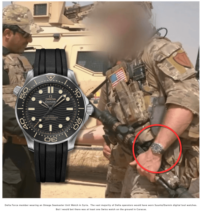 According to press reports, Maduro was captured in a safe house in Fuerte Tiuna, Venezuela's largest military complex. In the first confirmed pictures post-arrest, he is seen wearing a Nike sweatsuit, a watch notably absent. While speculation, this grey suit was likely provided by the Delta operators who likely would have stripped him of all belongings while on target, to mitigate concealed beacons or explosives. This would likely include the watch on his wrist.