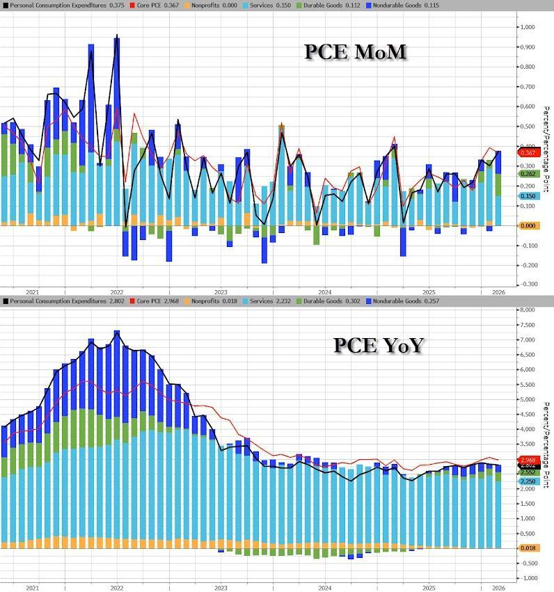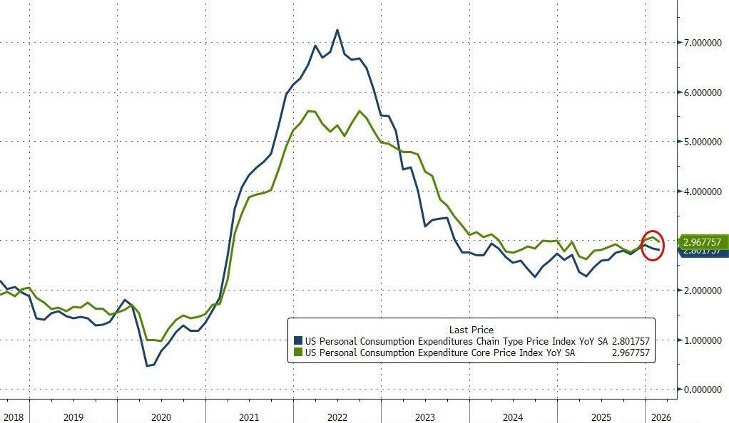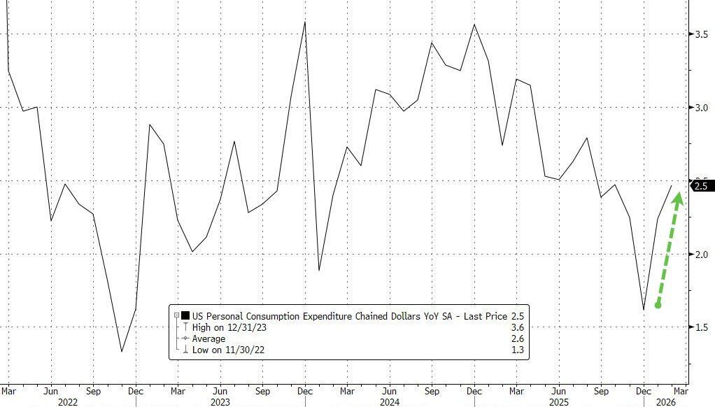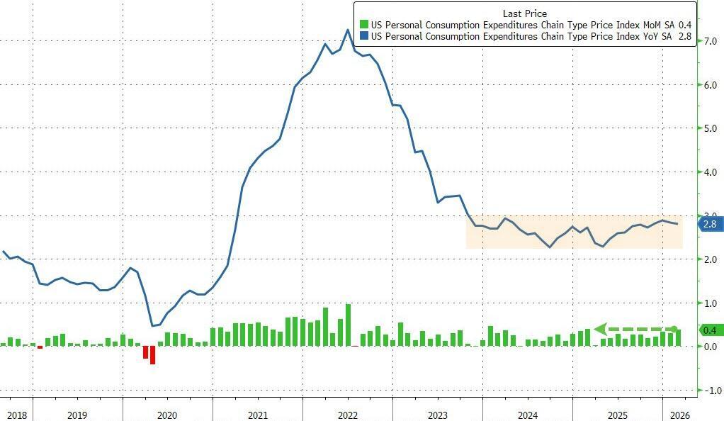 The headline PCE also rose 0.4% MoM (as expected - the biggest MoM rise since Feb 2025), up 2.8% YoY (also as expected)...