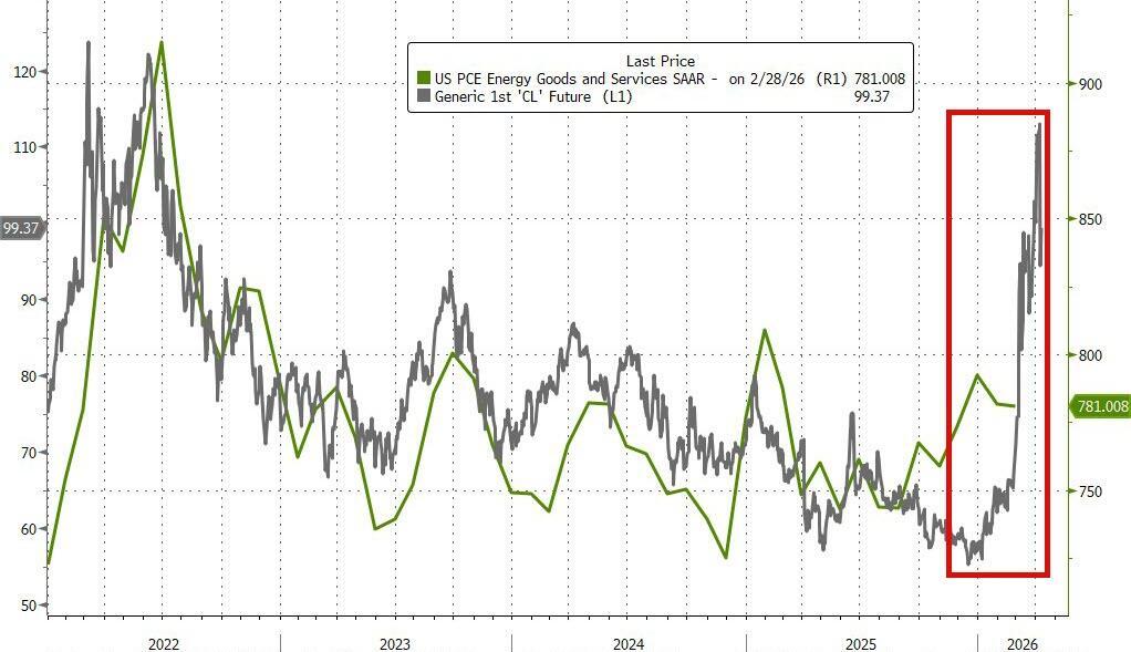 For those worried about the impact of crude oil's recent surge (since the start of the Iran war), it appears - somehow - that PCE's Energy component has already front-run some of the move but there's a lot more pain to come for March...