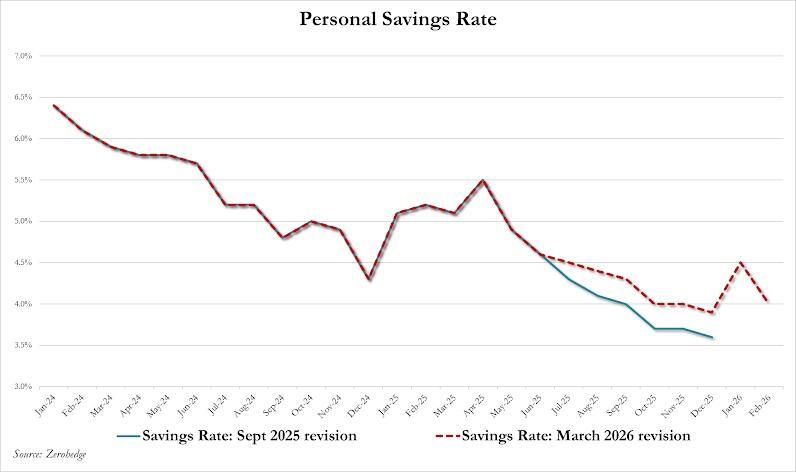 After jumping from 3.9% to 4.5% in January, Americans' savings rate dropped back to 4.0% in Feb (after another huge revision in late 2025), basically at the weakest level since Nov 2023...