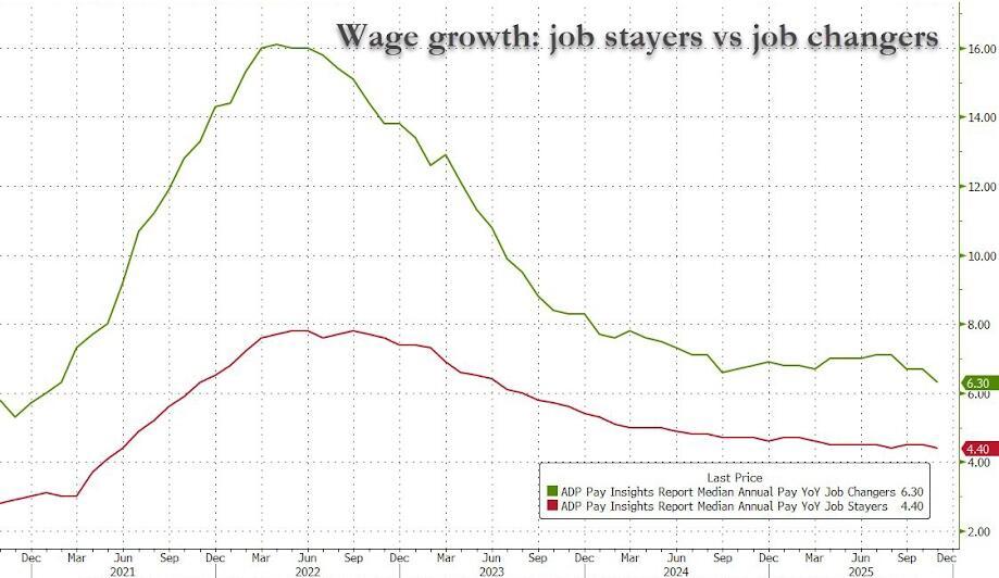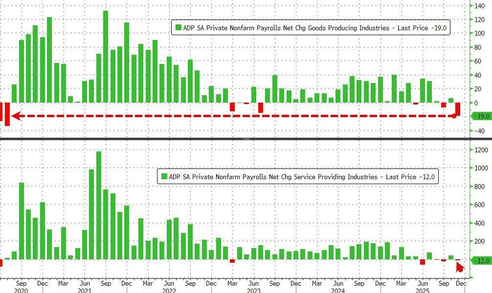 The official ADP report confirmed this weakness, printing 32k job losses in November (far worse than the +10k expected) and well down from the +47k revised for October...