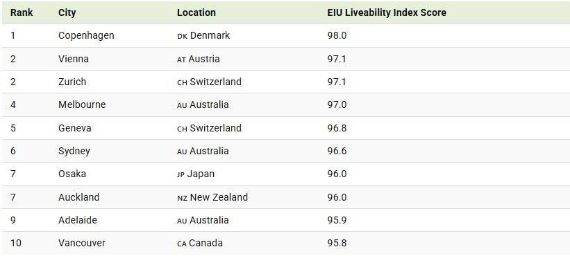 Below, we show the 10 most livable cities in the world according to The Economist, and their livability scores.