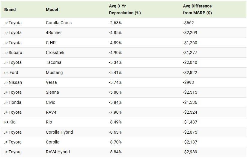 The Corolla Cross leads the list, depreciating just 2.63% (-$662) after three years. Other Toyota models such as the 4Runner, C-HR, and Tacoma also perform exceptionally well in this regard.