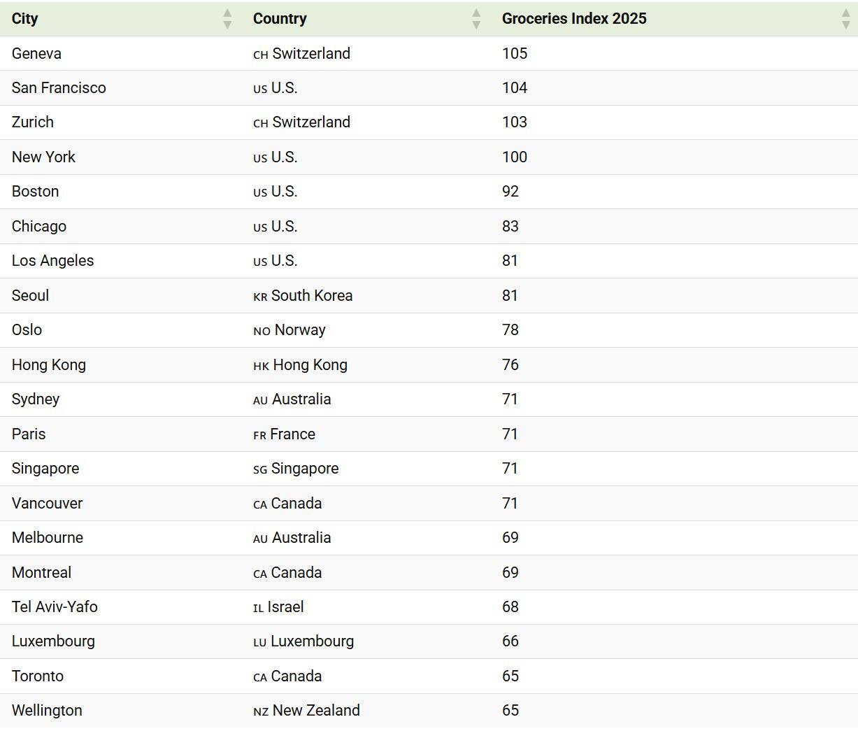 Switzerland is home to two of the top three most expensive cities for grocery prices, with Geneva seeing prices 5% higher than in New York City.
