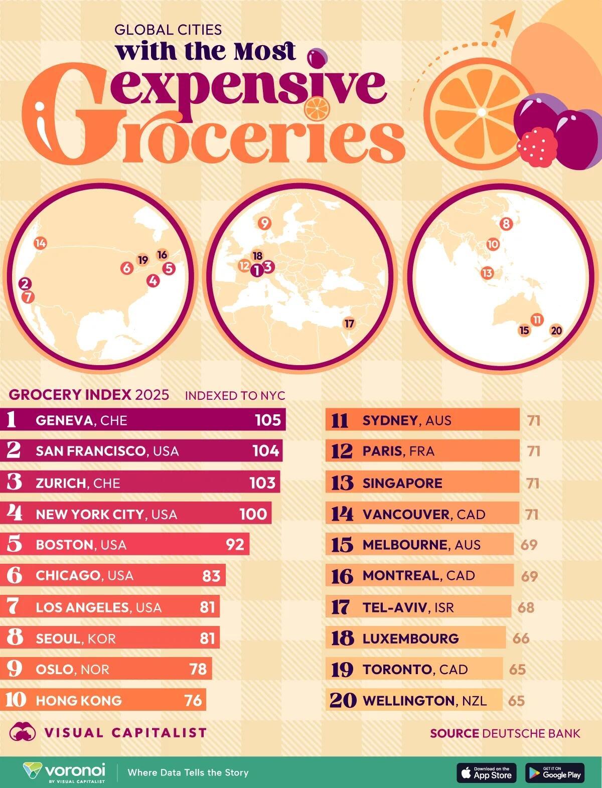 This graphic, via Visual Capitalist's Dorothy Neufeld, shows the cities with the most expensive grocery prices, based on data from Deutsche Bank.