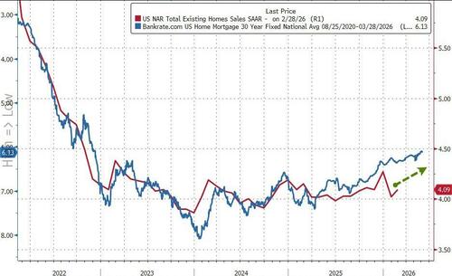 On the bright side, with mortgage rates at their lowest since 2022, existing home sales look set to continue to improve (unless Trump's war triggers more panic in rates)...