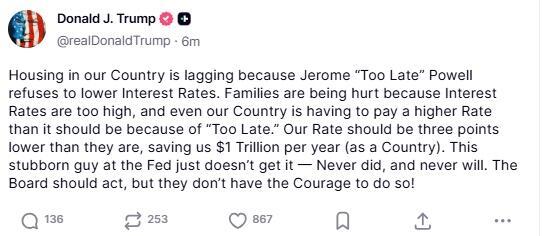“Housing in our Country is lagging because Jerome ‘Too Late’ Powell refuses to lower Interest Rates,” Trump said in a social media post Wednesday, referring to the Fed chair.