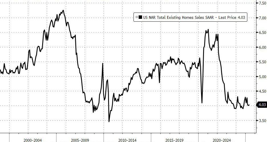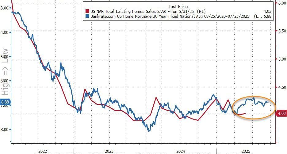 Existing home sales in the US rose by a modest 0.75% MoM in May (better than the -1.3% MoM expected), but remain down 0.75% YoY...