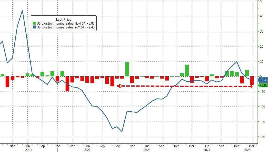 Following an unexpectedly large jump in February (biggest in a year), existing home sales were expected to drop significantly in March, and they did. Existing home sales fell 5.9% MoM (considerably worse than the 3.1% MoM drop expected) reversing the upwardly revised 4.4% MoM rise in February, dragging sales down 2.4% YoY...