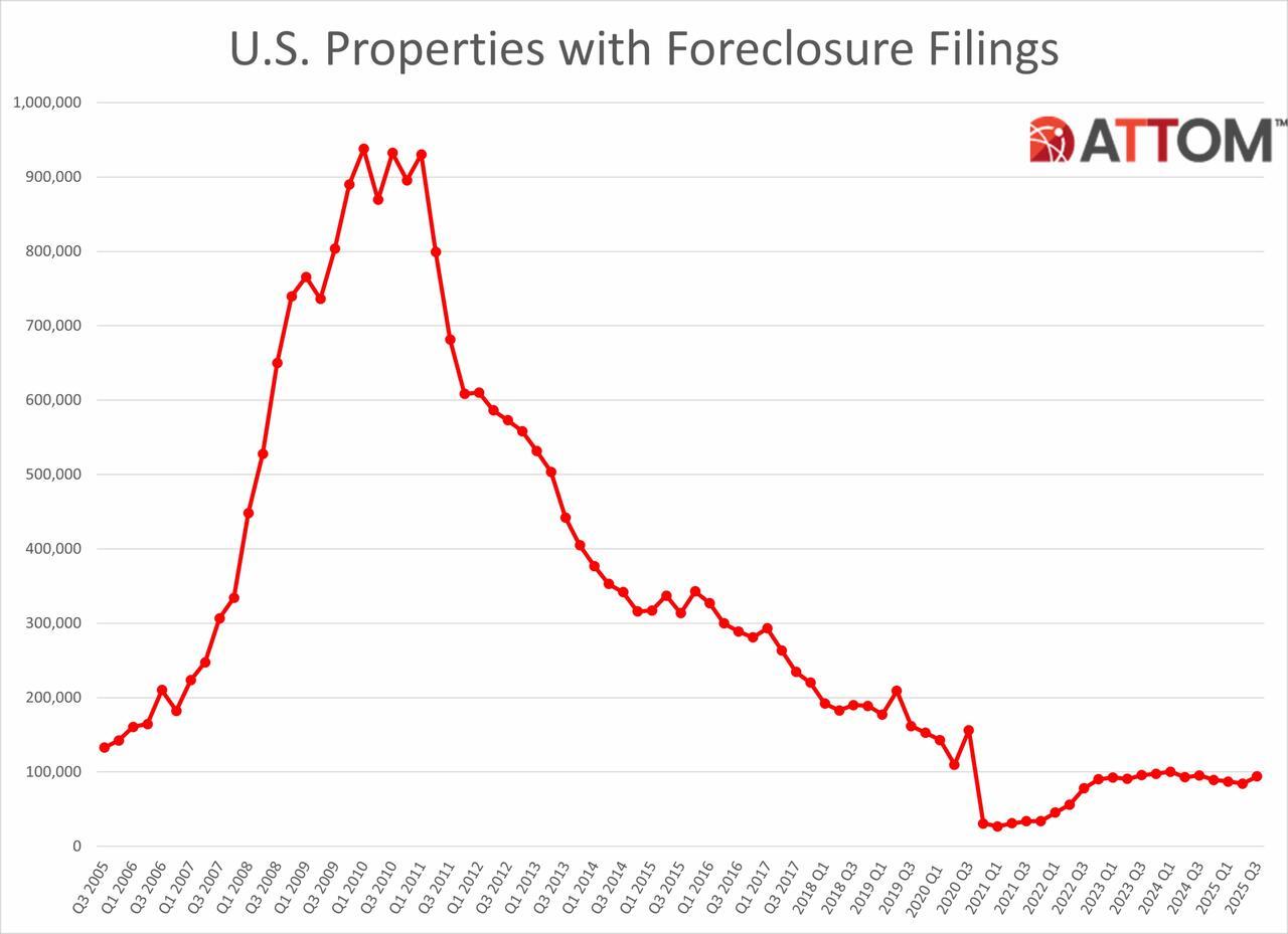 There were 101,513 properties with foreclosure filings across the United States during the third quarter of 2025, up by 17 percent from a year back, real estate analytics company ATTOM said in an Oct. 9 statement.
